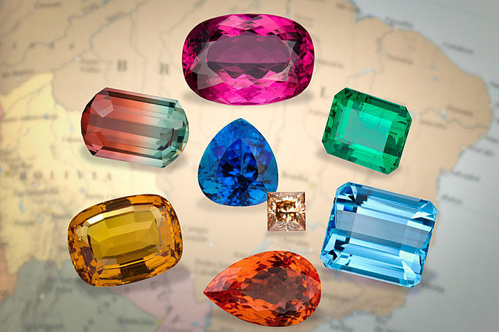 Так, например, на севере и юге (штат Байя) Бразилии в гранитных пегматитах добываются топазы, турмалины и бериллы. Широко известны залежи красных топазов: они расположены возле Ору-Прету. Многоцветные турмалины встречаются в бразильском штате Минас-Жерайс. В кварцевых жилах на территории Виктория-да-Конкиста находятся залежи аметистов, в базальтах штата Риу-Гранди-ду-Сул — агат.