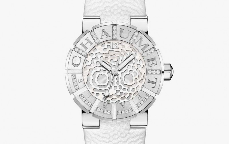 Class One от Chaumet — это одновременно часы и произведение искусства. Их появление стало возможным благодаря сотрудничеству парижского ювелирного дома и итальянского художника Лориса Цечини. Циферблат и ремешок часов украшены узорами водной ряби по мотивам инсталляции Цечини Wallwave Vibration.