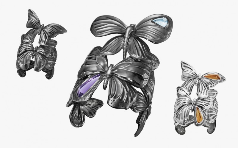 При этом дизайнер умудрился перевернуть представления об уязвимости бабочек с ног на голову: «Разрабатывая эти украшения, я хотел сделать их похожими на броню, как будто в форме этого талисмана вас защищает сама природа».