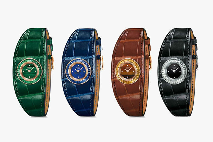В этом году часы Faubourg Manchette Joaillerie сочетают знакомый всем широкий кожаный ремешок с безелем и циферблатом, украшенными драгоценными и поделочными камнями. Сначала мастер по коже изготавливает браслет с использованием техники шитья внакидку, после чего шлифует грубые края. Затем контур ремешка окрашивается и сглаживается с помощью тепловой обработки паяльником. В конце его покрывают пчелиным воском для водонепроницаемости.