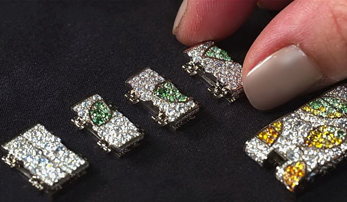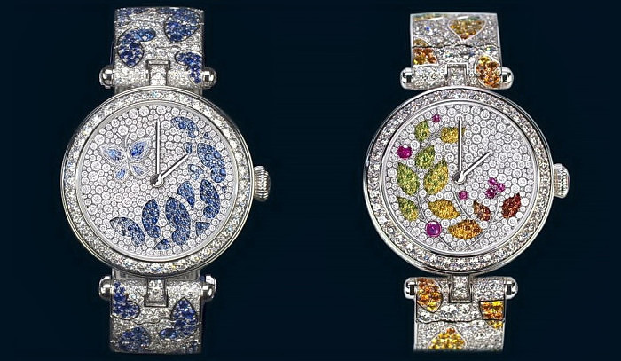 Циферблаты украшены бриллиантами и другими драгоценными камнями разных диаметров, идеально покрывающих поверхность благодаря технике инкрустации serti neige.