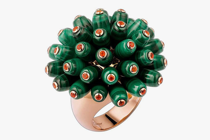 И, наконец, малахитовое кольцо Nouvelle Vague от Cartier использует камень в игривой композиции из бусин, украшенных огненным опалом и розовым золотом.
