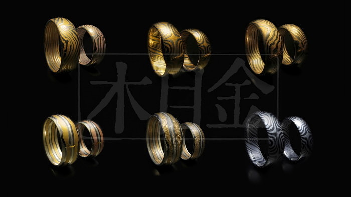 Обручальные кольца из коллекции “Эдо. Золотой век”. Материалы исполнения: белое золото 585 пробы, желтое золото 585 пробы, красное золото 585 пробы, зеленое золото 585 пробы, серебро 925 пробы в технике мокуме гане. Обработка поверхности: техника дзамэ (с яп.  — шкура ската). Артель Мастерских «ТАУ»