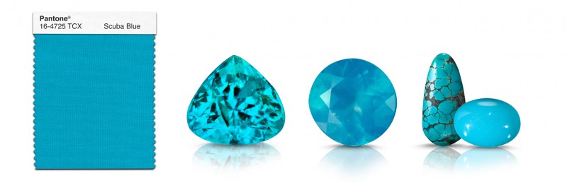 Один из цветов Pantone на весну-лето 2015 года — Scuba Blue (или «водолазный» синий) — который «обладает атмосферой спасительного бегства, напоминающей отпуск на берегу тропического океана». Это приятный тон, который вызывает в памяти ленивые деньки, проведённые на уединённых пляжах. С головой нырнув в геммологические воды, GIA подобрали драгоценные камни этого цвета.
