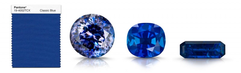Названный Pantone центром весенне-летней палитры 2015, «Классический синий» способствует поддержанию живительного спокойствия и вызывает мысли о море. Немало самоцветов имитируют краски океана. На ум сразу приходит сапфир, но и менее популярных драгоценных камней этого оттенка достаточно — бенитоит, кашмирский сапфир и апатит, например.