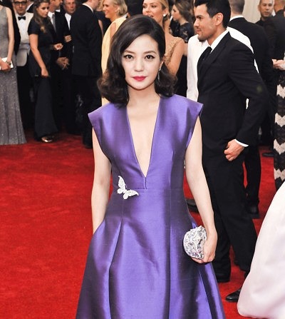 Актриса Чжао Вэй на дела на Met Gala 2015 брошь-бабочку от Tiffany & Co.