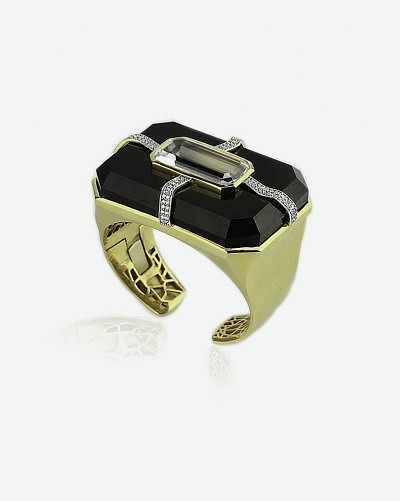 Другие ювелиры подхватили идею «вкладывать» один камень в другой. Так, Kara Ross предлагает вызывающий браслет Cava с вставкой из горного хрусталя, который словно бы парит над основанием из чёрного оникса, сдерживаемый только четырьмя лентами крохотных бриллиантов. В кольце из той же коллекции изумительного оттенка зелёный хризопраз величественно покоится на подушке из горного хрусталя, окружённый ореолом белых бриллиантов.