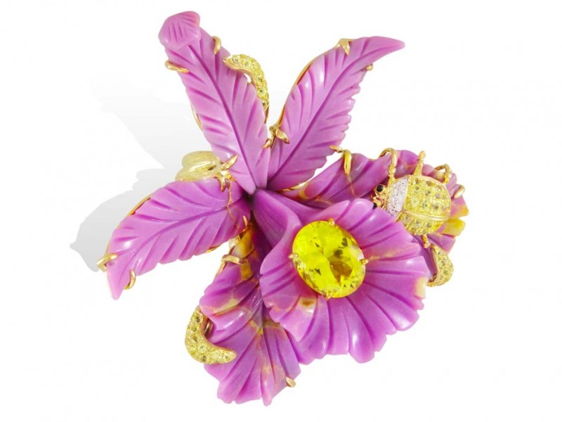 Чтобы подчеркнуть эти золотистые брызги, Лидия и использовала жёлтые топазы и сапфиры, глянцевая текстура которых превосходно контрастирует с матовой поверхностью фосфосидеритов.