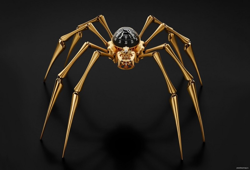 Мы уже рассказывали об этом необычном и пугающе реалистичном детище MB&F. Настольные часы Arachnophobia выполнены в виде достаточно крупного представителя отряда членистоногих, на спине которого расположился циферблат часов. Источником вдохновения для разработчика часов Максимилиана Бюссера стала скульптура паука по имени Maman (от французского «мама»), созданная в 1999 году Луизой Буржуа.
