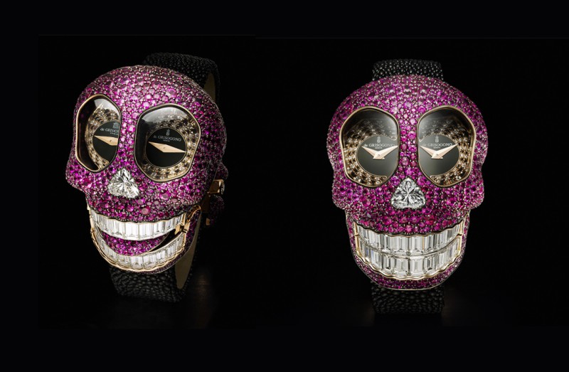Вот уж кто точно знает, как впечатлить публику, так это Фаваз Груози! Если перечисленное выше для вас «мелковато», то вот вам предложение на миллион. Точнее на полмиллиона долларов. Необычный браслет-часы, инкрустированный невероятным количеством исключительных драгоценных камней, вплоть до самых неожиданных мест. Сам череп покрыт 23 каратами рубинов, черных или бесцветных бриллиантов (в зависимости от модели), еще два десятка бриллиантов представляют собой сверкающий оскал. А чтобы окончательно убедиться в пугающей продуманности украшения, можно раскрыть сияющие зубы и полюбоваться на язык, выложенный рубинами или розовыми сапфирами.