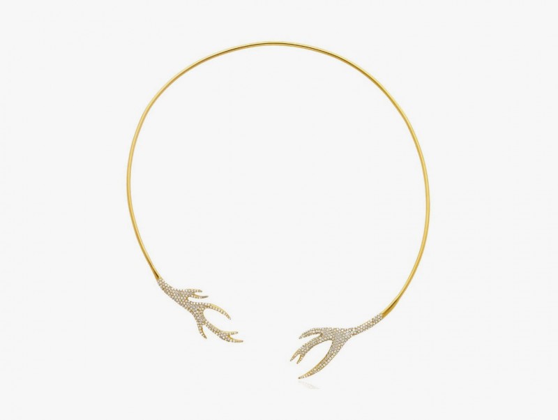Колье от Marc Alary было создано под впечатлением от изящных рогов газели. Витые конусы из золота с бриллиантами цвета шампанского на обоих концах элегантно подчёркивают линию шеи и ключицы.