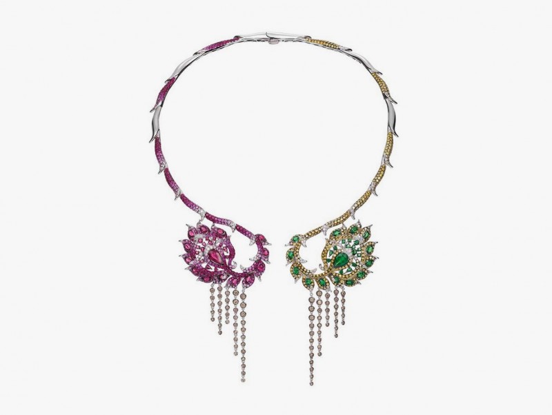 Ювелирный воротник от Stephen Webster из модной коллекции Magnipheasant полностью порывает с традициями минимализма. В его основе — яркая, чувственная комбинация из огненно-красных опалов, рубинов, жёлтых сапфиров и чёрных бриллиантов.