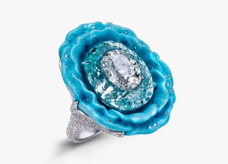 В этом году многие дизайнеры экспериментировали с сочетанием мягкого, матового цвета бирюзы и разноцветных драгоценных камней, создавая жизнерадостные и энергичные украшения. Эта концепция, в том числе, была блестяще реализована в кольце от Boghossian Jewels. Изготовленные вручную нежные изящные бирюзовые лепестки деликатно окружают крупный турмалин параиба, в центр которого с помощью фирменной технологии Boghossian помещён овальный бриллиант весом 2,52 карата.