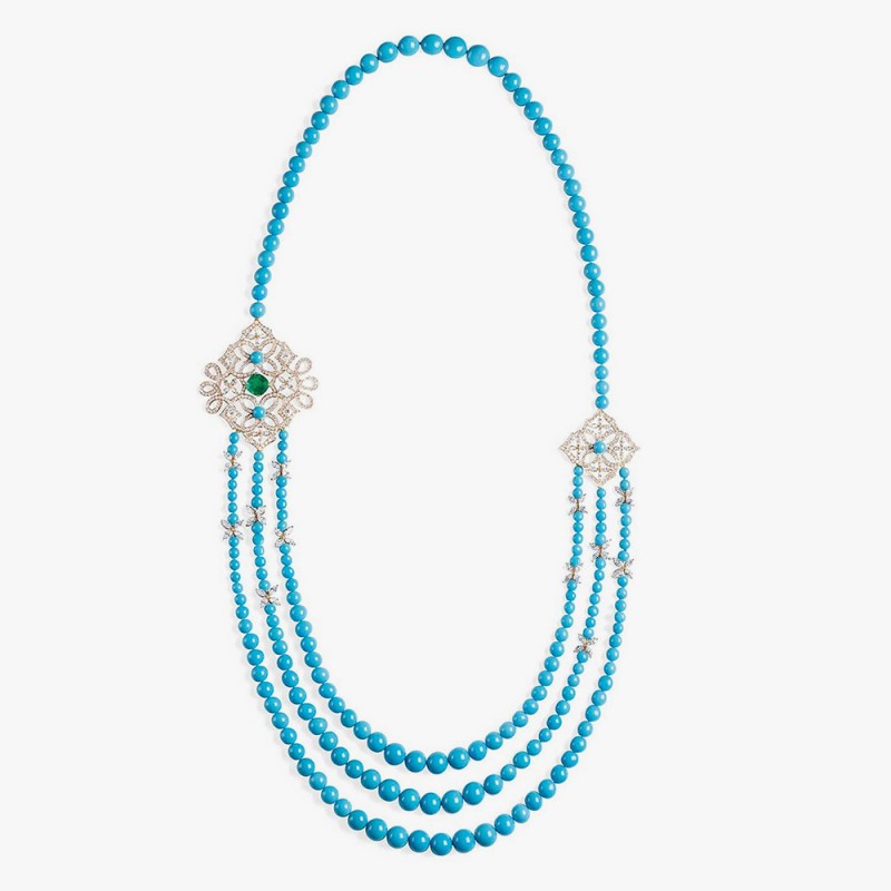 Разумеется, бренд de Grisogono, известный своими ювелирными экспериментами, также не обошёл бирюзу вниманием. Коллекция Melody of Colour, как и подобает своему названию («Мелодия цвета»), является настоящим буйством красок, в котором не последнюю роль играют фиолетовые аметисты, словно парящие на облаках из нежнейших зеленовато-голубоватых бирюзовых бусин.