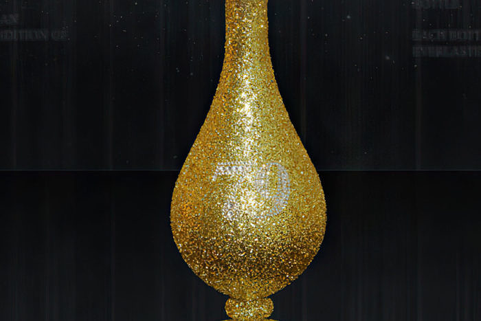 Бутылка изготовлена из высококачественного горного хрусталя и украшена чистым золотом, а также 113 бриллиантами. Драгоценные материалы призваны обосновать непомерный ценник — 900 тысяч долларов. Наполнена полулитровая бутылка, как вы могли догадаться, вовсе не водой из-под крана, а водой из источника Санкт Леонхард в Германии, в которую были добавлены хлопья настоящего съедобного золота.