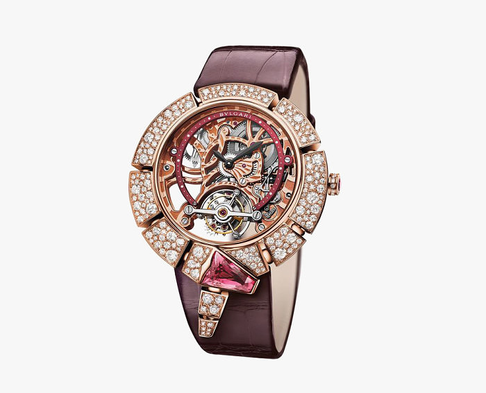 Это самая первая модель часов Bulgari, сочетающая фирменный змеиный дизайн с часовыми усложнениями. Определенно, внимания заслуживает роскошное драгоценное оформление, однако особое удовольствие владелице этих часов должно доставить наблюдение за идеально точной работой открытого механизма и 60-секундного турбийона.
