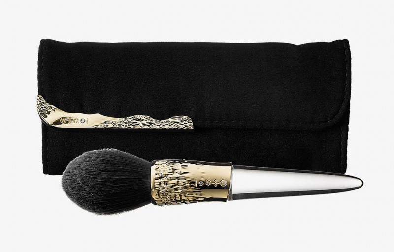 Центральная часть каждой кисти покрыта 24-каратным золотом, украшена кристаллами Swarovski, а сами кисточки прикреплены к ручкам из акрилового стекла — элемент, подсказанный прошлыми ювелирными коллекциями Alexis Bittar. Но и на этом авторы коллекции не остановились: пять эксклюзивных кистей помещены в очаровательный кейс из оникса — совсем как драгоценности на витрине ювелирного магазина.