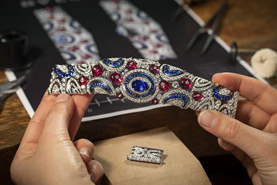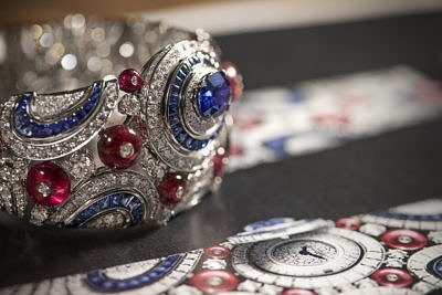Сапфиры фантазийной формы, круглые бриллианты и турмалины-кабошоны сочетаются в изящной гармоничной структуре, которая обеспечивает комфортное ощущение часов на руке.