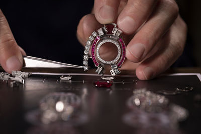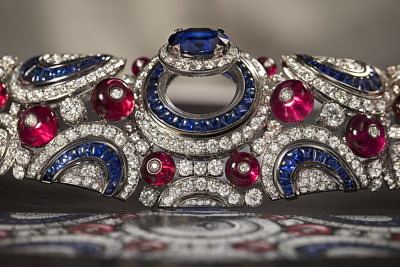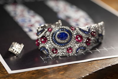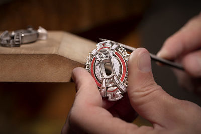 Циферблат скрыт под крышкой, дизайн которой строится вокруг старинного мозамбикского рубина весом 6,3 карата. Браслет часов инкрустирован рубинами багетной огранки и бриллиантами.