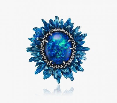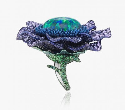 Камень второго кольца как будто наэлектризован и источает целый спектр оттенков синего со случайными вспышками зелёного. Опал весит 20 карат и окружён изящным ореолом из бриллиантов, который переходит в стремительные лепестки синего титана. Цветок гармонично сочетается со стеблем, который сворачивается в изящное кольцо, украшенное цаворитами, лазуритами и коричневыми бриллиантами.
