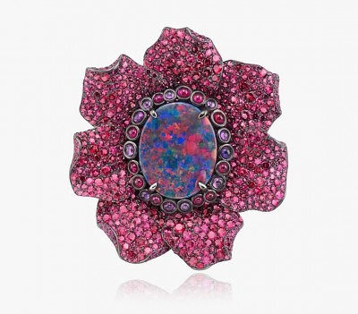 Третье кольцо отличается разнообразием цветовых оттенков, которые подчёркивают задумчивую темноту 9-каратного чёрного опала. Камень окружён ореолом из переливающихся красных рубинов и фиолетовых сапфиров, и их краски отдаются эхом в циркониевых лепестках, украшенных розовой шпинелью. Само кольцо сделано из переплетений розового и белого золота с вкраплениями чёрных бриллиантов.