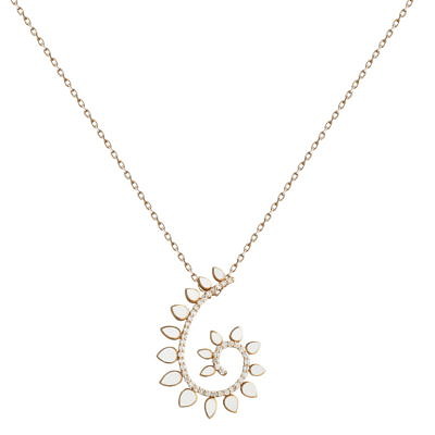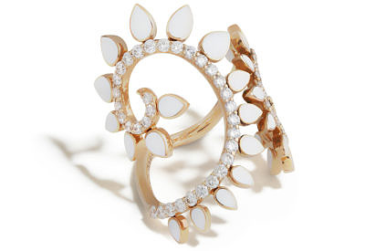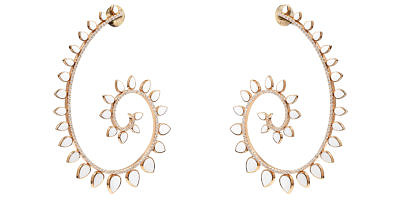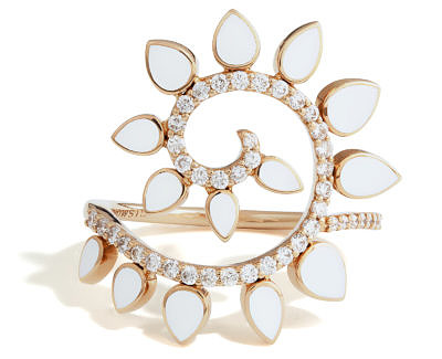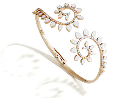 Украшения Genesi имеют форму доисторических спиральных раковин, а каждый изгиб золота подчёркнут дорожкой из белых керамических лепестков и бриллиантов.