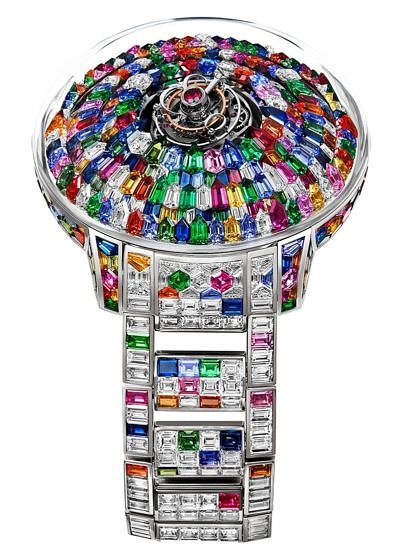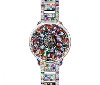Вот, и новые Mystery Tourbillon Arlequino способны впечатлить своей драгоценной палитрой. Поверхность часов сверкает более чем 1000 драгоценных камней всех цветов радуги, что повлекло за собой ожидаемый результат: узнать время стало крайне сложно. Впрочем, маловероятно, что кто-то приобретет эти часы ради определения времени. Ну, а если это будет так, то владельцу роскошного изделия придется напрячь зрение, чтобы заметить бриллиант весом 8,18 карата, который указывает часы, и еще один — на 9,5 карата, — который отмечает минуты.