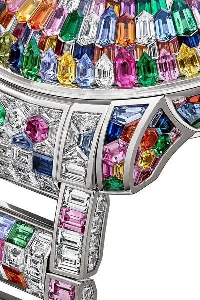 Ремешок, как и 50-миллиметровый корпус, выполнен из белого золота и усыпан драгоценными камнями, что в сумме обеспечивает часам 38 карат бриллиантов и 46 карат разноцветных сапфиров