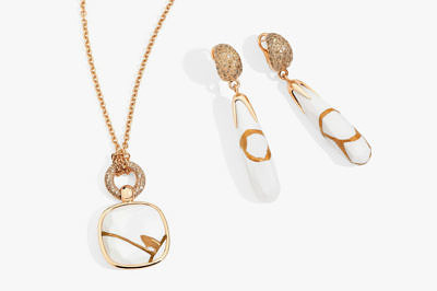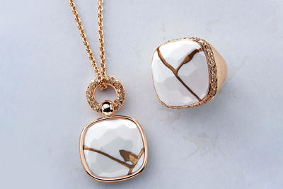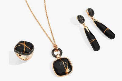 Первая в 2021 году линейка Pomellato основана на традиционной японской технике ремонта «кинцуги», в которой для сплавления разбитых кусков фарфора используется золотая смола. В случае с украшениями эта техника используется для того, чтобы починить расколовшийся гагат (окаменелое дерево) и кахолонг, и тем самым превратить камень в уникальное ювелирное изделие, украшенное неповторимыми золотыми трещинами.