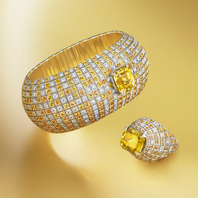 • а также Soleils в желтых сапфирах и ярких красно-оранжевых спессартинах.