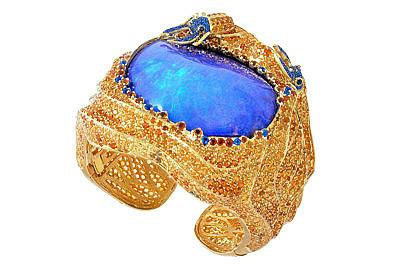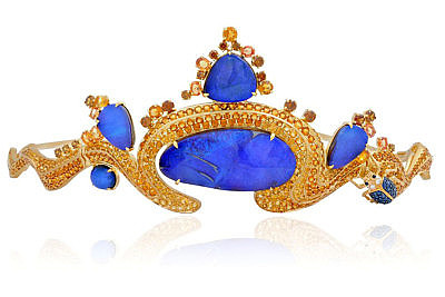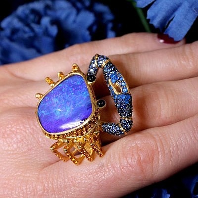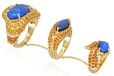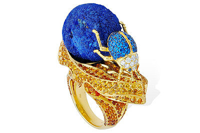 Конечно, в коллекции Sahara полно сюрпризов. Крошечные голубые жуки-скарабеи являются элементом декора многих ювелирных изделий. Забавный маленький краб предстал в виде кольца. Паук с мышиной головой тащит голубой болдер опал в свои сети. Трудолюбивый жучок упорно катит свой драгоценный груз — темно-синий шар азурита.