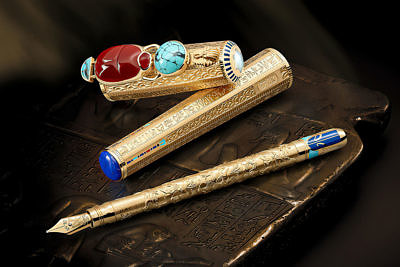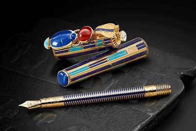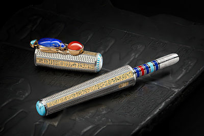 Корпус ручки из 18-каратного золота внутри напоминает головной убор посмертной маски Тутанхамона; золотое перо украшено гравировкой богини Маат и крошечным сапфиром.