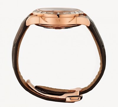 Роскошный экстерьер часов — корпус из 18-каратного красного золота диаметром 38,7 миллиметров. Экипированные сапфировым стеклом часы способны без труда справляться с погружениями до 30 метров. Сверкающий обод корпуса украшен ни много ни мало 24 трапециевидными бриллиантами огранки «багет».