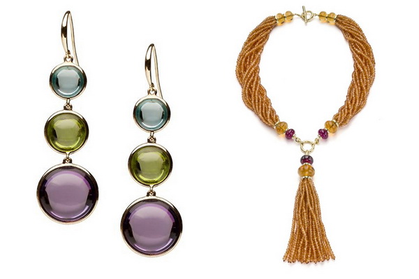 Трехуровневые серьги с дисками из аметиста, перидота и голубого топаза из коллекции «Mischief». Оранжевое ожерелье с кисточкой и со вставкой из рубелитов из коллекции «G-One».