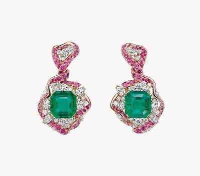 Бриллианты самых разнообразных огранок: багет, маркиз, классическая круглая, овальная, грушевидная — расположены неидеальными рядами, чтобы передать изменчивую текстуру шёлка. Браслеты выглядят как изящные ленты, обёрнутые вокруг запястья. Каждый миллиметр «золотого шёлка» покрыт сверкающими бриллиантами и другими драгоценными камнями.