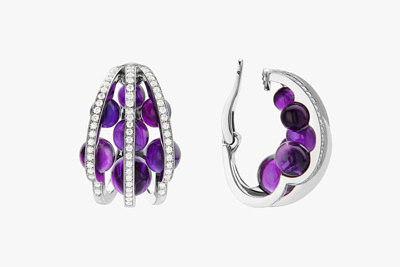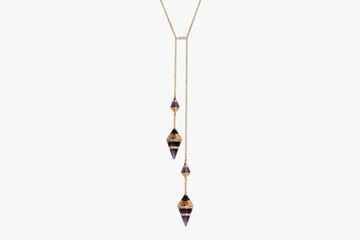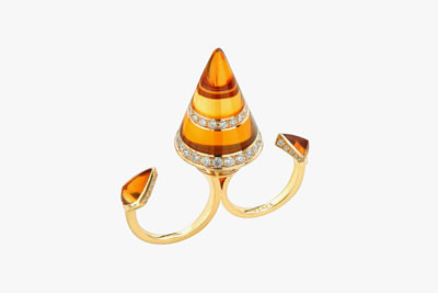 Линейка Virya объединила в себе кольца, серьги и колье из золота с драгоценными и полудрагоценными камнями — аметистами, ониксом, цитринами — в форме идеальных конусов, окруженных греческим орнаментом, носящим название «меандр».